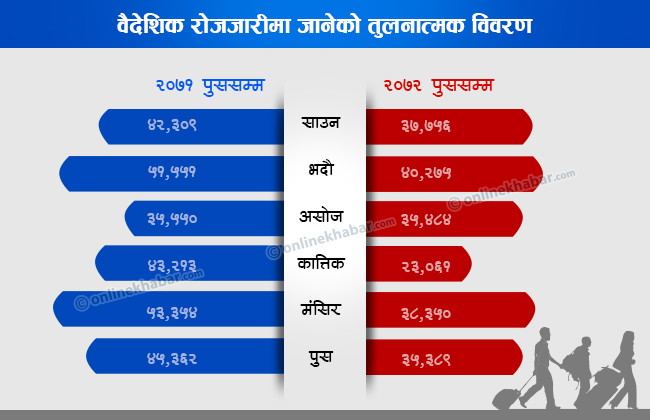 गत वर्षको पहिलो ६ महिनासम्म २ लाख ७१ हजार ३ सय युवा विदेश पुगेकोमा यो वर्ष ६१ हजार कम युवा मात्रै बाहिरिएका छन् ।